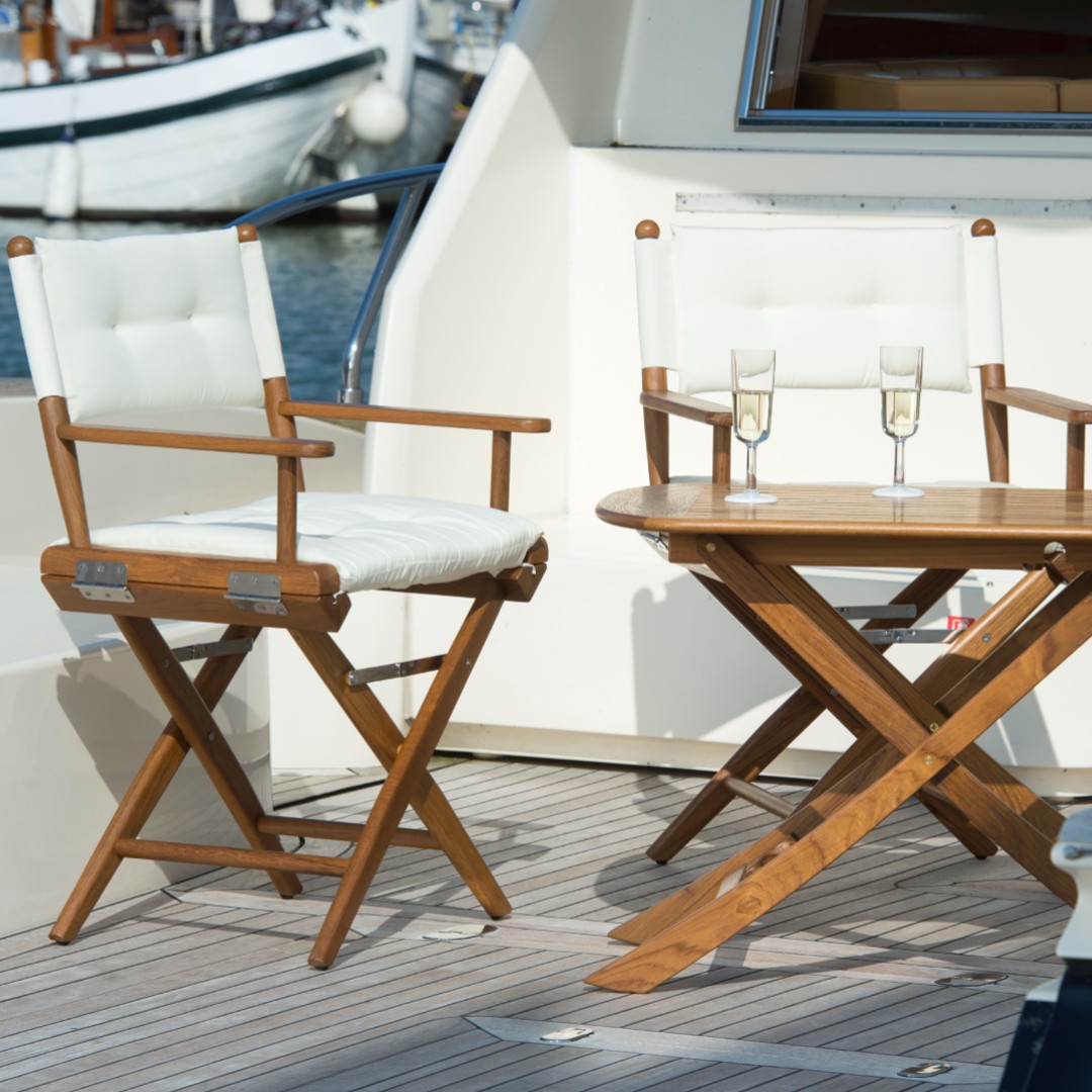 Our Directors Chair is one of our more practical items. It's features include being able to fold the chair away when not in use, saving valuable space on board, thanks to the 316 stainless steel fittings. The Directors Chair also has rubber feet to protect your deck or polished floor.
